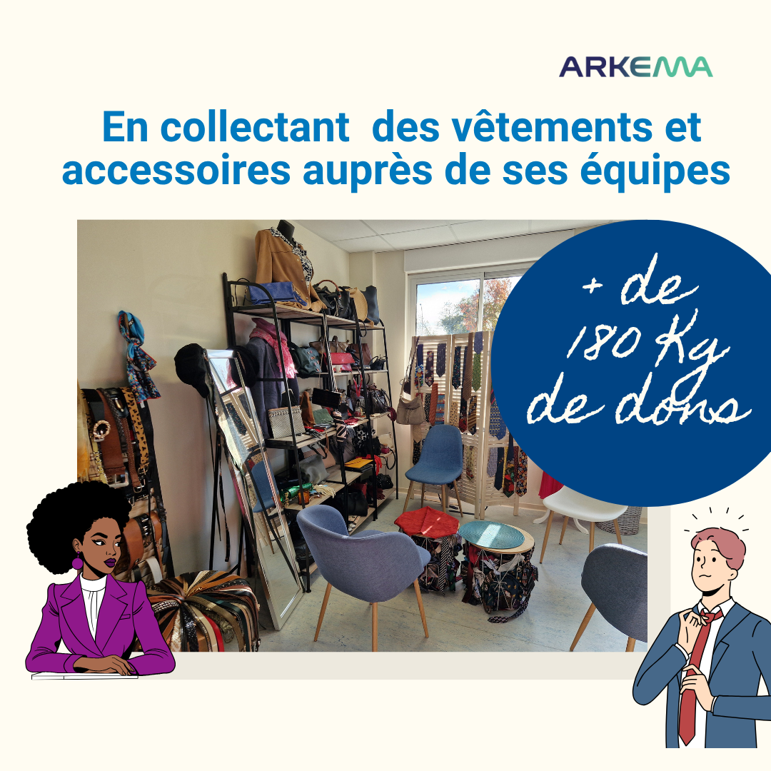 Grâce à la mobilisation et à la générosité des collaborateurs ARKEMA et au soutien du Siège Social, ces dons permettront à LA CRAVATE SOLIDAIRE DE PAU constituer des tenues pour les bénéficiaires de ses ateliers “Coup de pouce”, destinés à les accompagner dans leur préparation aux entretiens d’embauche, d’alternance, de stage ou de formation.